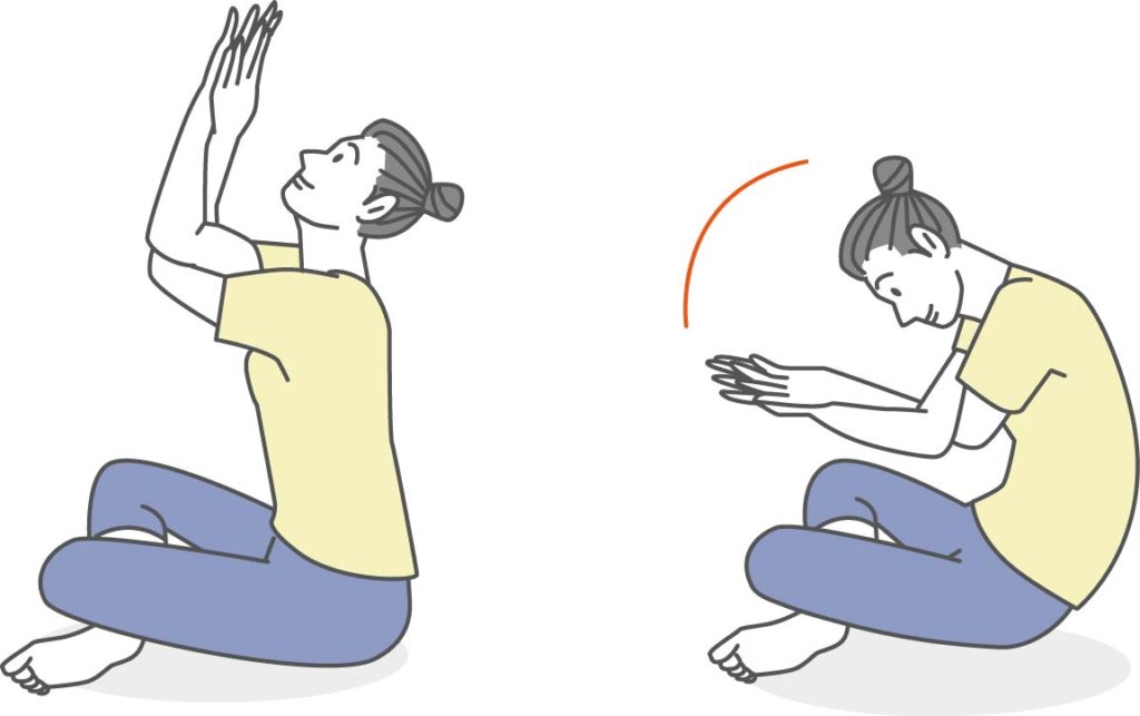 ② 息を吸いながら両腕を上げ、吐きながら肩を下ろす。肩甲骨をしっかり動かすことで、じんわり熱が生まれます。