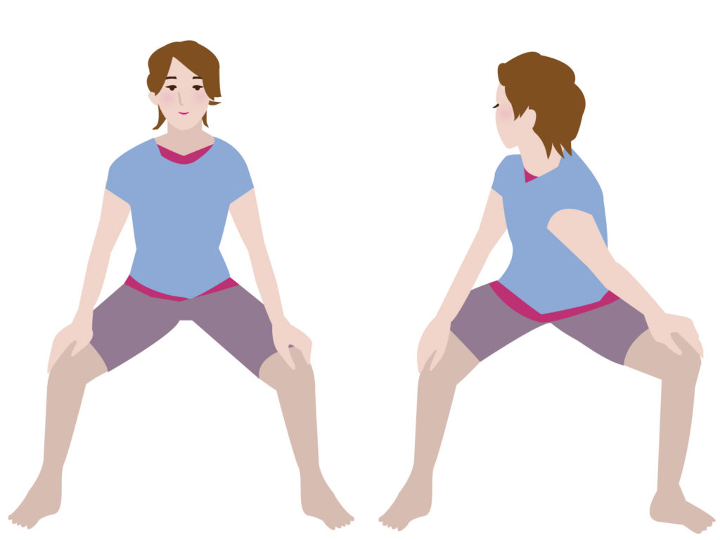 ①両足を肩幅よりやや広めに開いて立ち、両つま先を立て、踵を内側に入れると同時に両膝を曲げる。